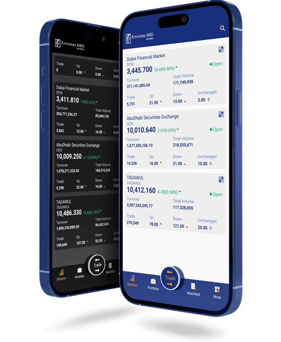 If you are already an Emirates NBD customer download our new app and explore a world of comprehensive trading solutions. Designed for both Individual and Institutional Clients, gain access to major markets in the MENA region, supported by dedicated channels.